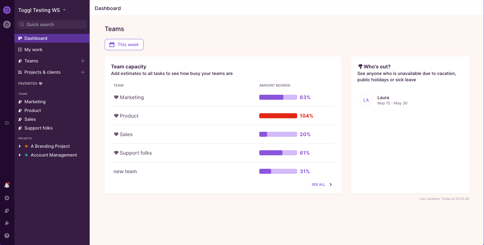 The team dashboard aims to give you an overview of your teams' capacities. Calculated based on the estimated time, it allows you to assess the booked time amount of different teams and see all people not working, including scheduled time offs and public holidays.