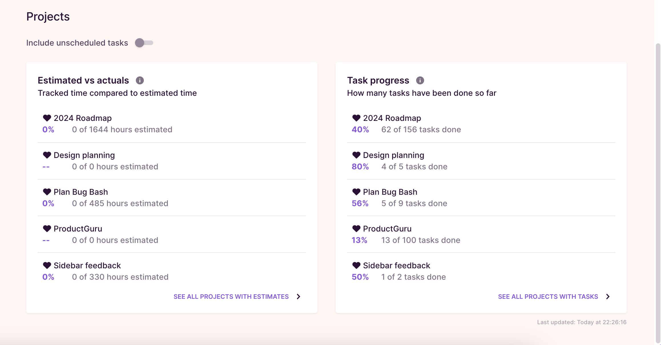 Task progress looks into the ratio between all tasks under the projects and tasks marked done. This is a useful tool to understand the overall progress of the tasks.